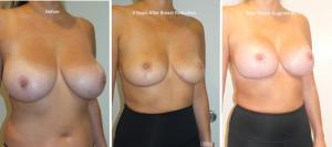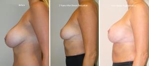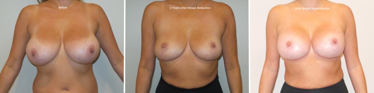 The surgeries above were performed in two separate surgeries. The goal of the patient was to have firmer, fuller breasts that appeared more augmented. She desires upper pole fullness that could not be achieved with breast lift alone. This was accomplished in two separate surgeries to give her the desired result safely and reproducibly. The breasts were first lifted and reduced. This was followed by breast augmentation.